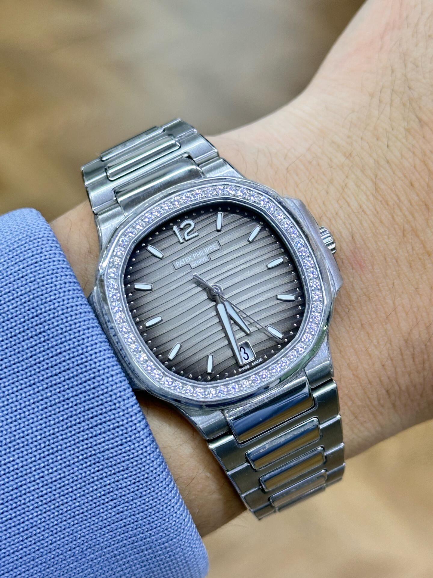 • Patek Philippe Nautilus 35.2mm 7118-1200A-011 Gray Opaline Dial & Diamond Bezel in Stainless Steel Bracelet Ladies Watch