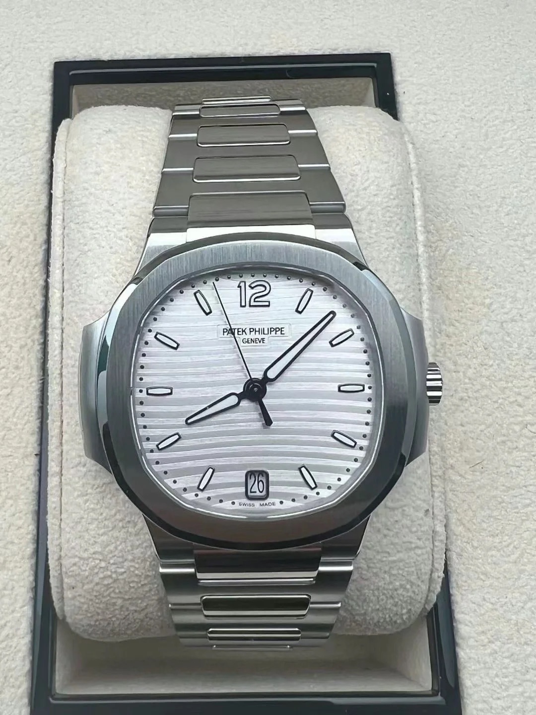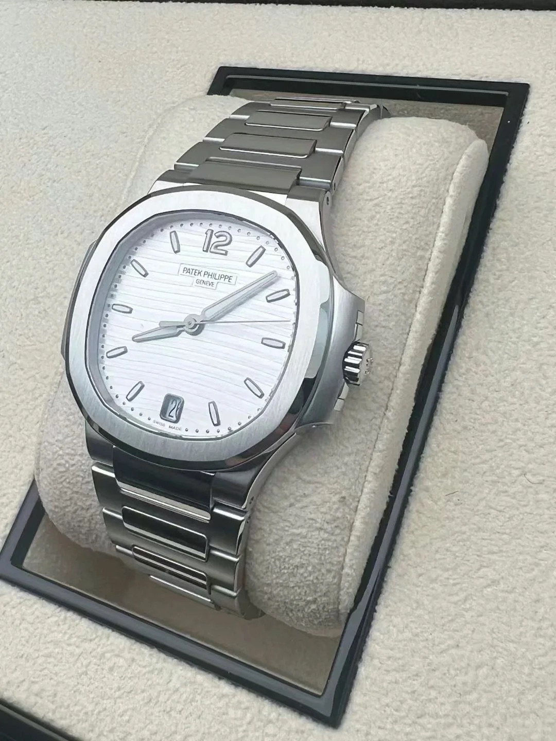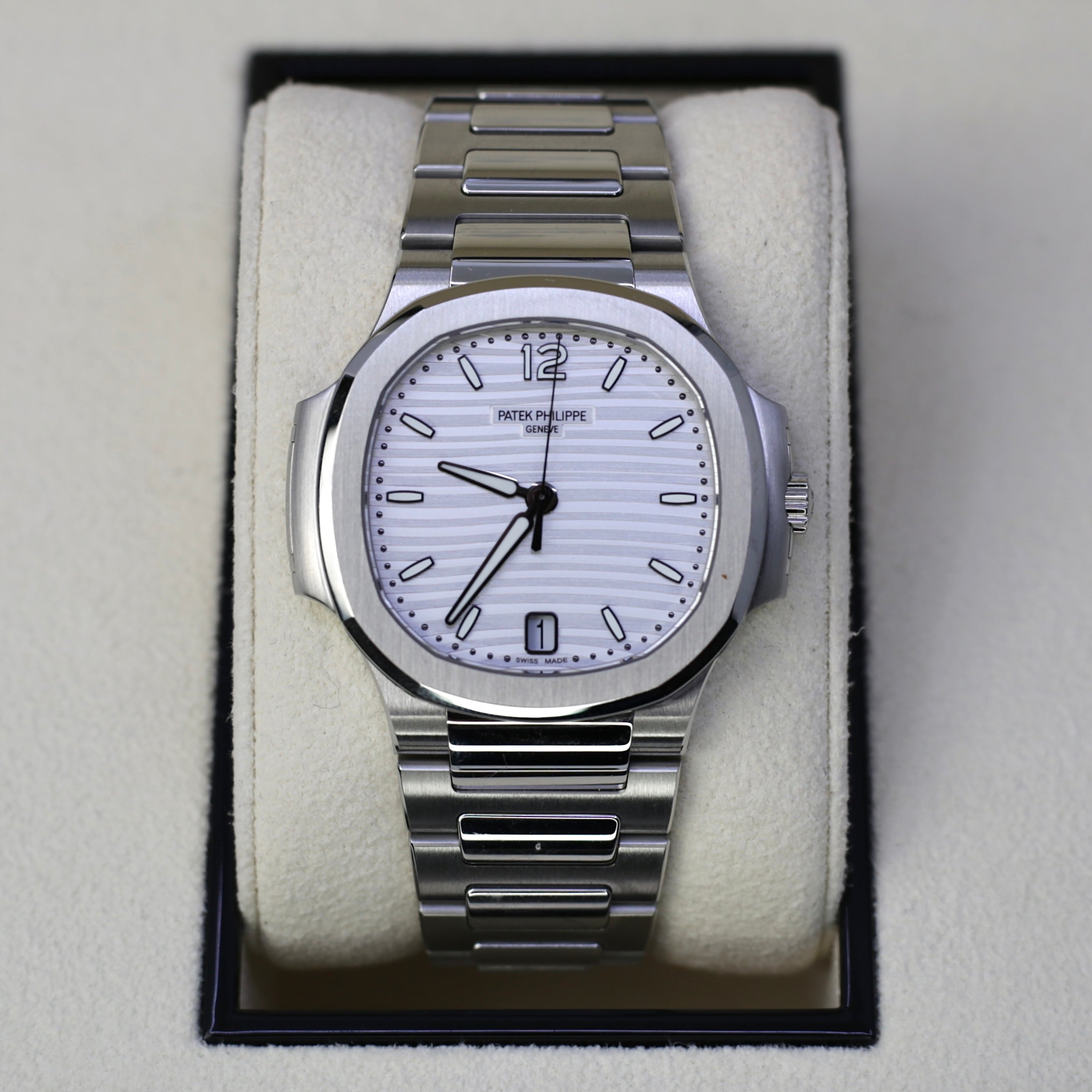 Patek Philippe Nautilus Automatic Ladies Watch 7118/1A-010. The Ladies Automatic Nautilus wristwatch in stainless steel emphasizes its casual elegance and very feminine style with two new dial colors: silvery opaline and smoke gray. The gently undulating embossed decor underscores its unmistakably ladylike interpretation of the Nautilus. The applied numerals and the hands are luminous to assure optimized legibility. Mechanical self-winding movement. Caliber 324 S C. Ladies Automatic Nautilus. Date in an aperture. Center sweep second hand. Silvery opaline dial, gold applied hour markers and numerals with luminescent coating. Steel bracelet with Nautilus fold-over clasp. Case: steel. Sapphire-crystal case back. Water resistant to 60 m. Case diameter (10–4 o’clock): 35.2 mm. Height: 8.62 mm