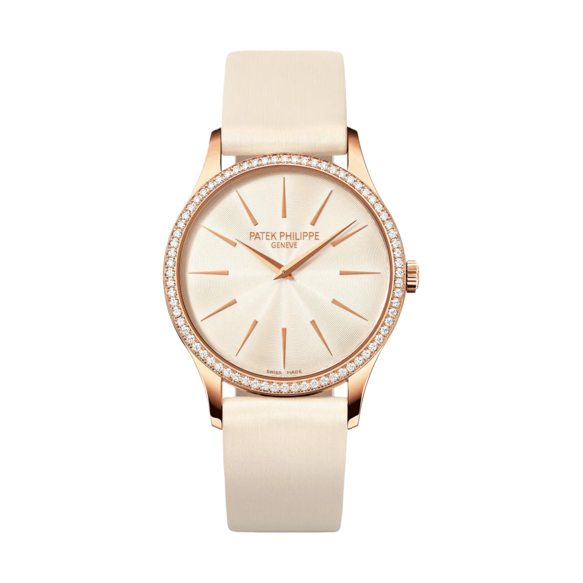 Patek Philippe Calatrava 33mm 4897R-010 Cream Dial & Diamond Bezel in 18K Rose Gold Pearly White Brushed Satin Strap Ladies Watch