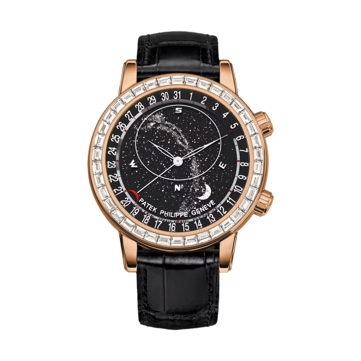 Patek Philippe Grand Complications Celestial 44mm 6104R-001 Black Disks Sky Background & Moon-Phase Dial & Diamond Bezel in 18K Rose Gold Shiny Black Alligator Strap