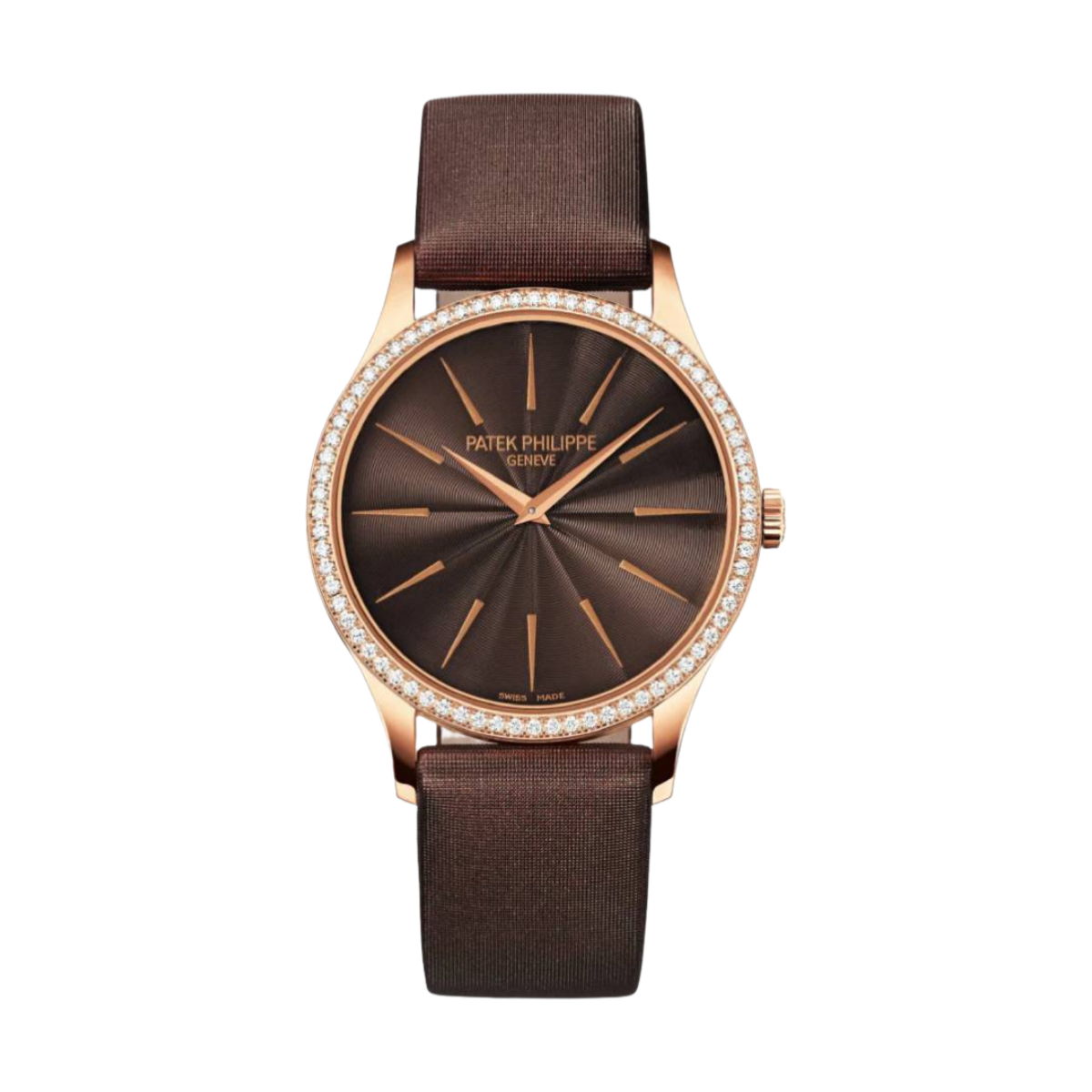 Patek Philippe Calatrava 33mm 4897R-001 Chocolate Brown Dial & Diamond Bezel in 18K Rose Gold Chocolate Brown Satin Strap Ladies Watch