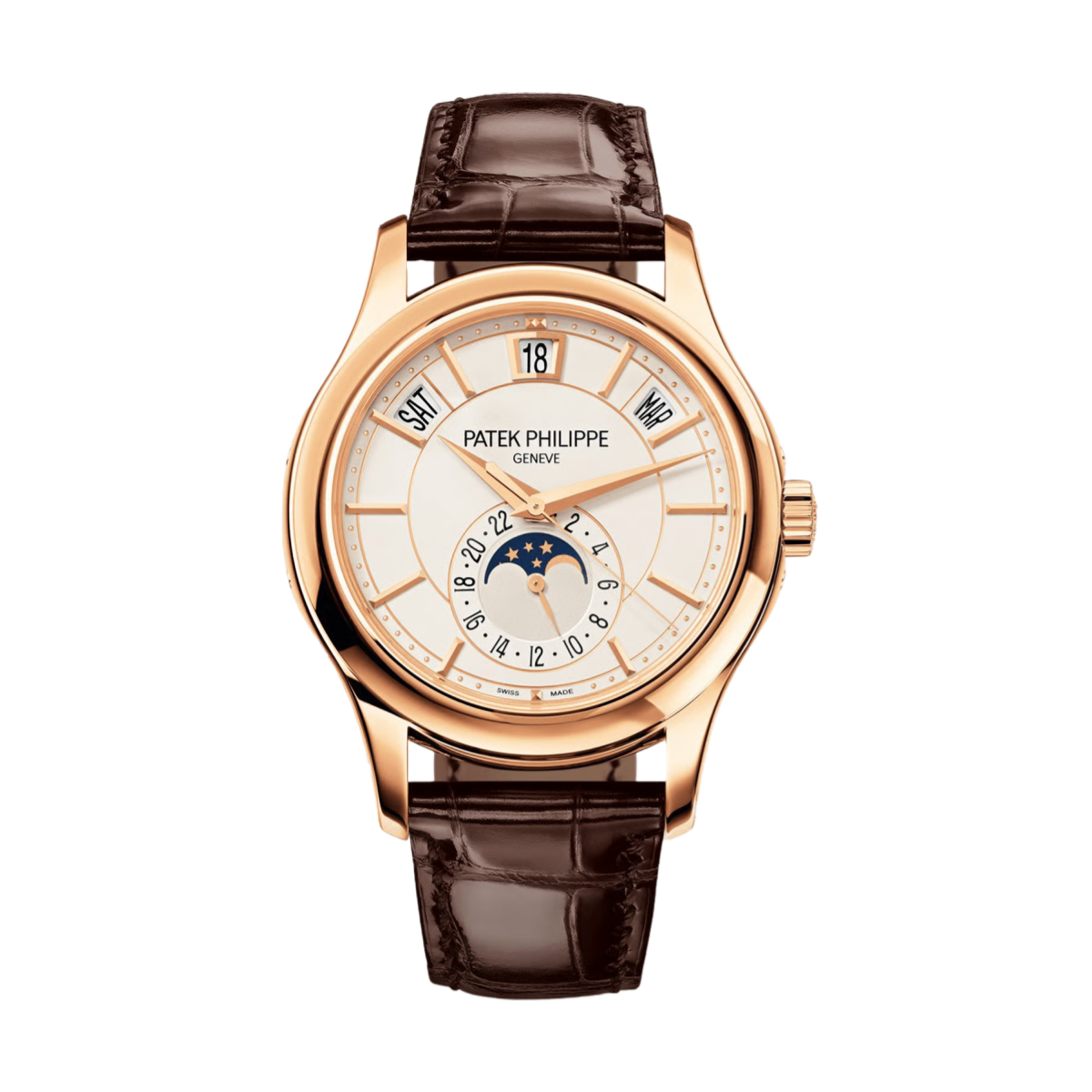 Patek Philippe Complications Annual Calendar 40mm 5205R-001 White Moon-Phase Dial, 18K Rose Gold Brown Leather Strap