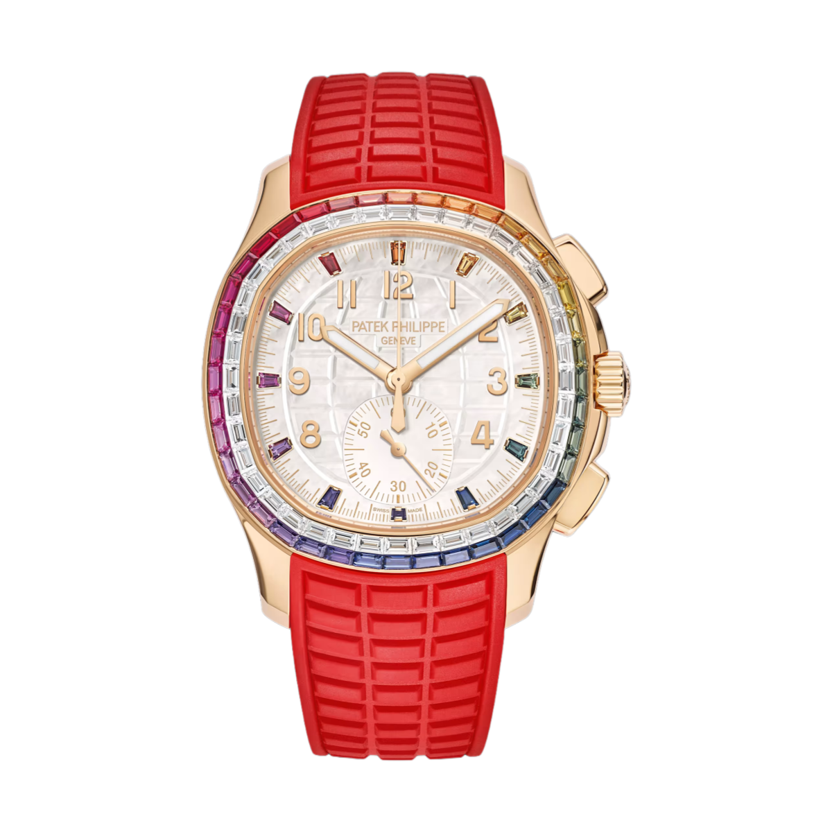 Patek Philippe Aquanaut Luce 39.9mm Watch 7968/300R-001 White Mother of Pearl & Sapphire Dial & Diamond Bezel in 18K Rose Gold Red Composite Rubber Strap