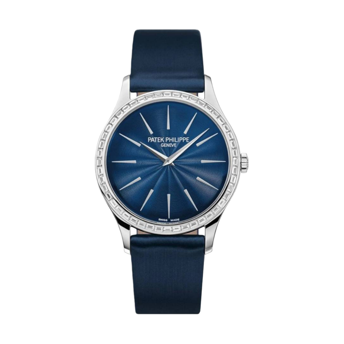 Patek Philippe Calatrava 33mm 4897G-001 Night Blue Dial in 18K White Gold Night Blue Brushed Satin Strap Ladies Watch