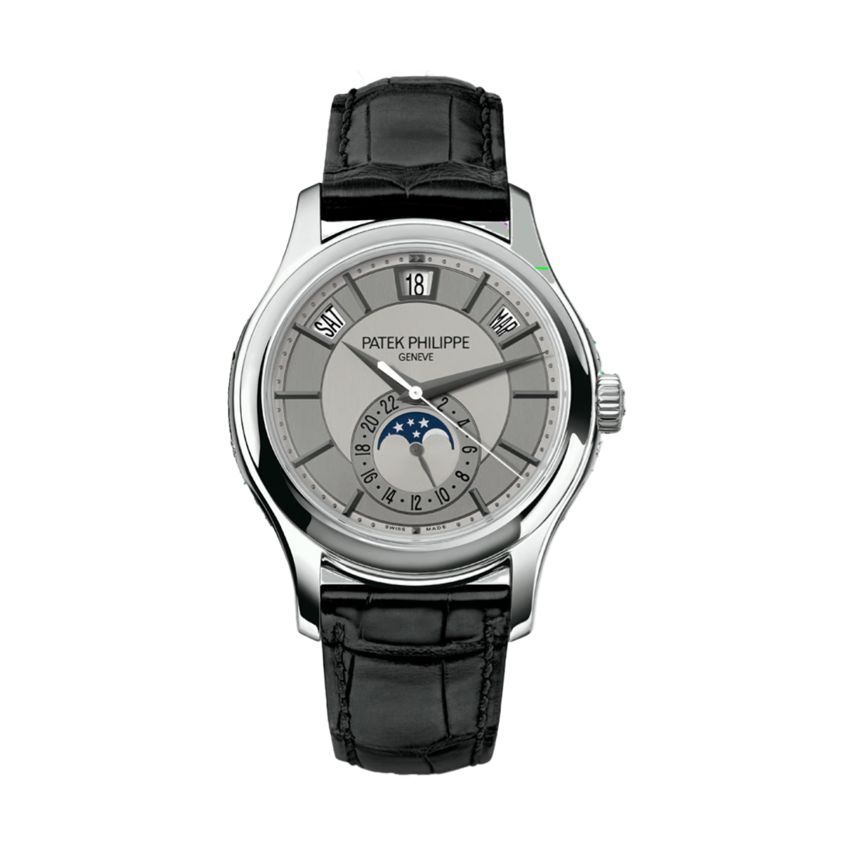 Patek Philippe Complications Annual Calendar 40mm 5205G-001 Rhodium Grey Moon-Phase Dial in 18K White Gold Black Alligator Strap