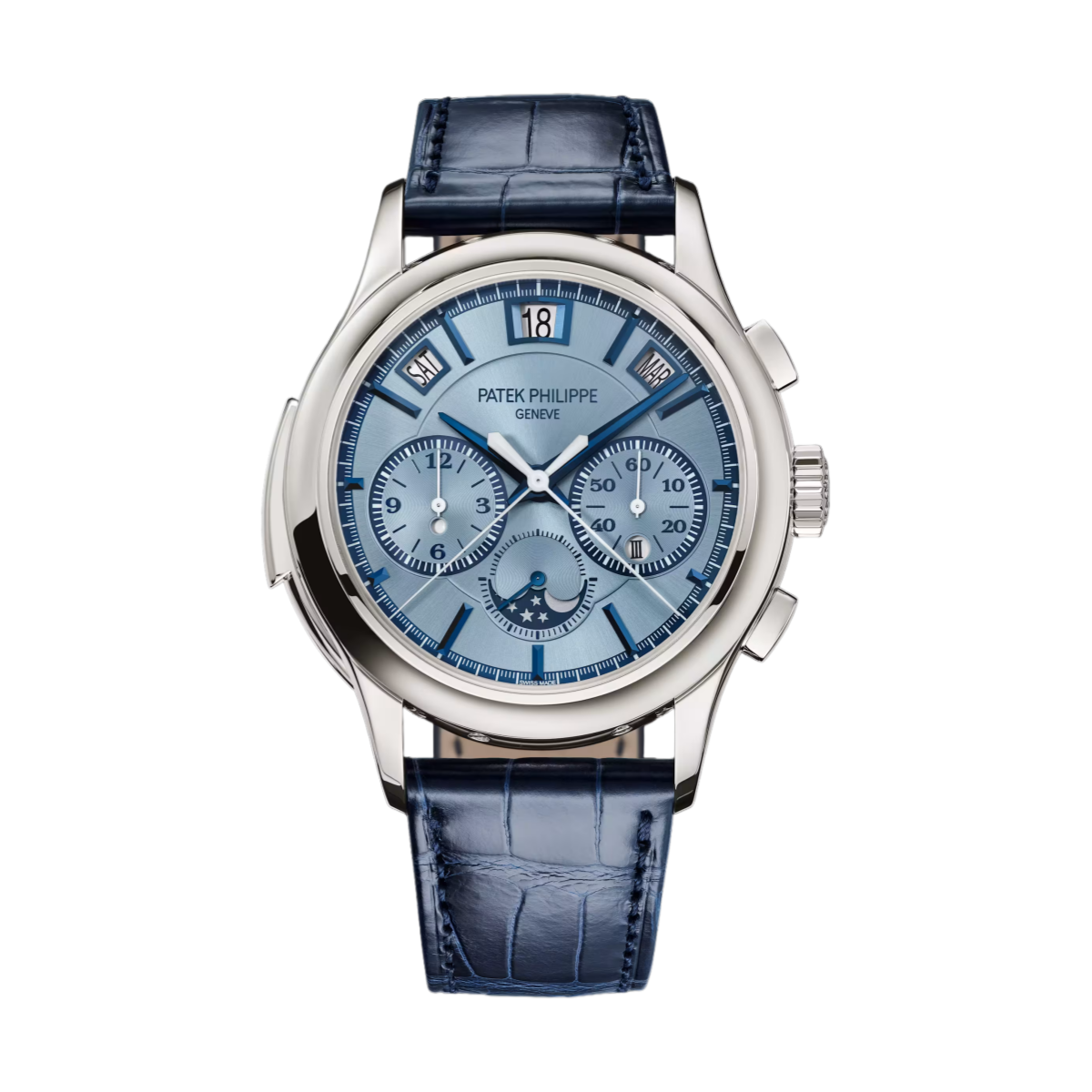 Patek Philippe Grand Complications 42mm 5308G-001 Sunburst Ice Blue Dial in 18K White Gold Shiny Navy Blue Alligator Strap