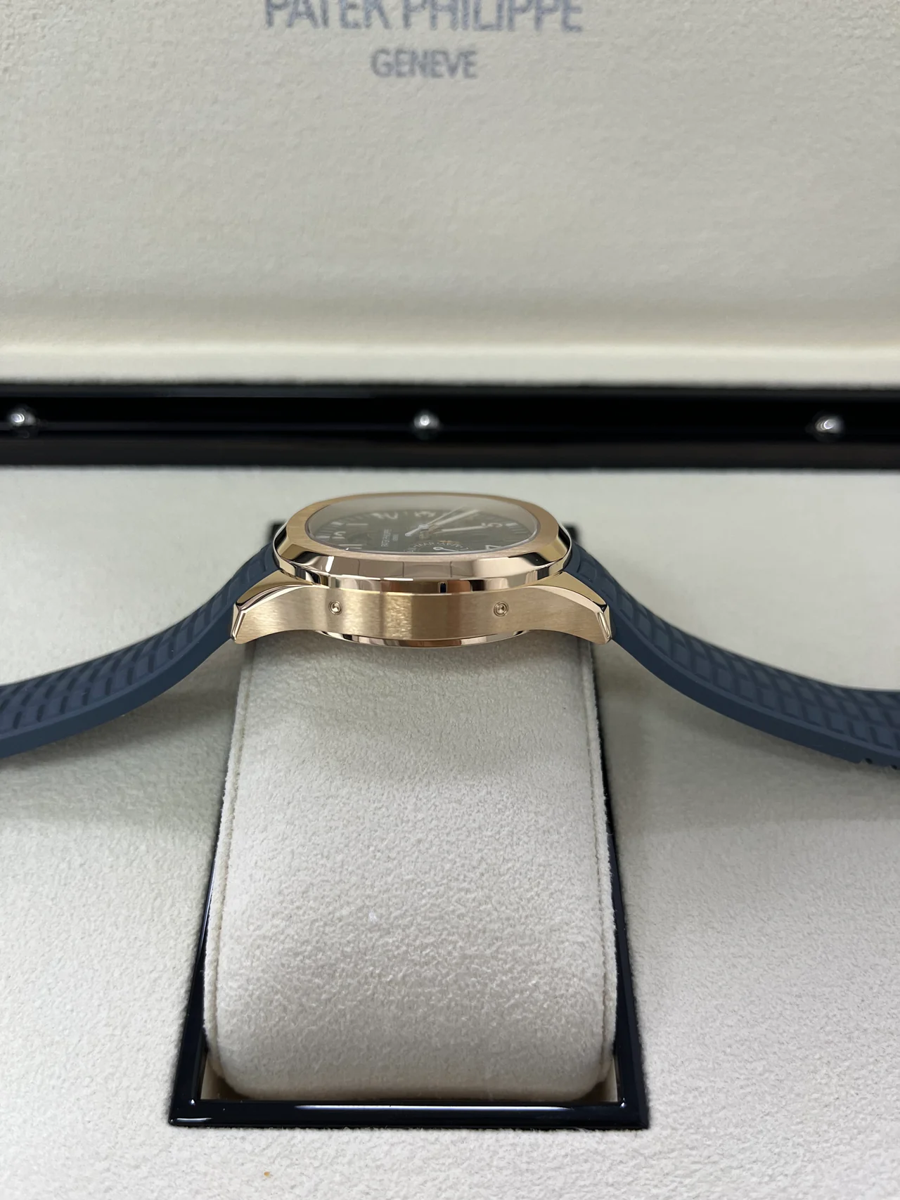 The blue-gray dial features the distinctive embossed Aquanaut pattern, providing a striking contrast to the rose gold applied Arabic numerals and matching gold hands, both coated with luminescent material for optimal legibility. The annual calendar complication includes a moon phase display at 6 o’clock, a day and month indicator in windows at 12 o’clock, and a date subdial at 3 o’clock, offering a perfect balance of practicality and elegance.
