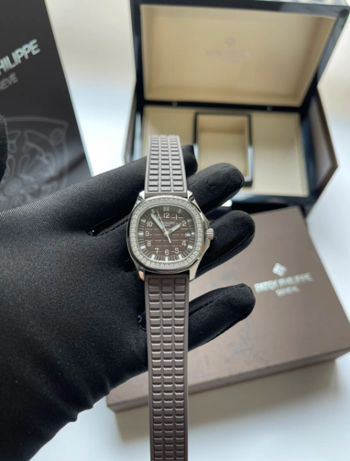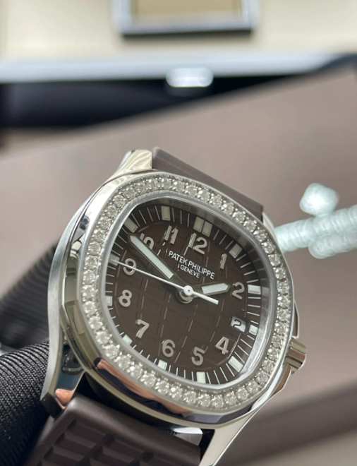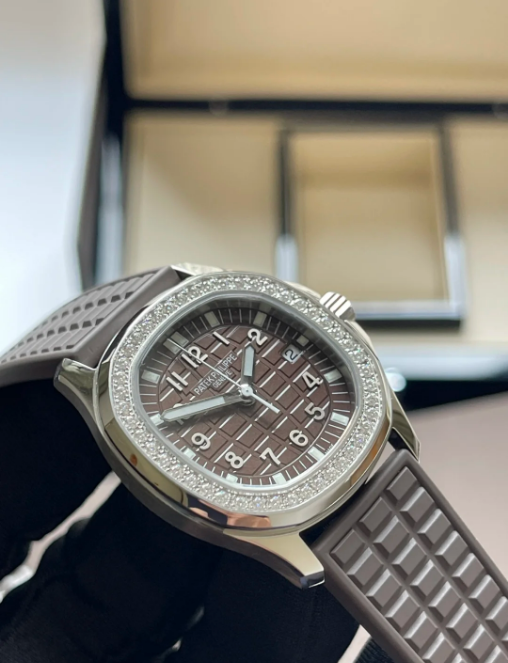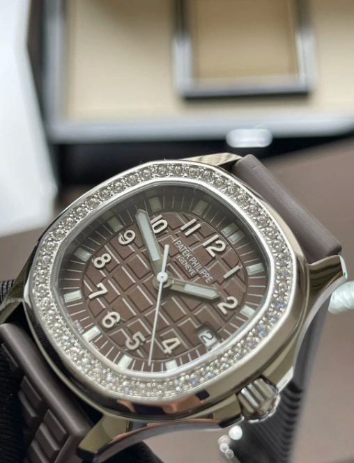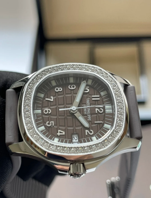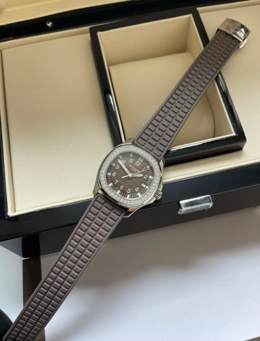 Patek Philippe Aquanaut Stainless Steel With Diamonds Brown Quartz 5067A-023. The stainless steel case measuring 35.6mm in diameter is water resistant to 120m and features a bezel set with approximately 1 carat of diamonds. The dial features date aperture and a center sweep seconds hand. The quartz E23-250 S C caliber is comprised of 80 parts and 8 jewels. The watch is secured with a “Tropical” composite strap, a recurring feature of the collection, and the Aquanaut deployment clasp.