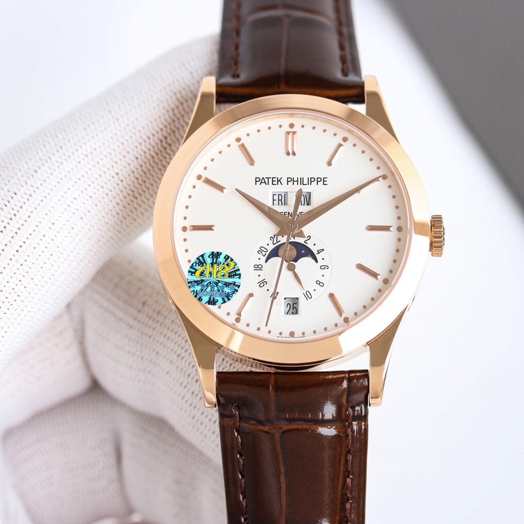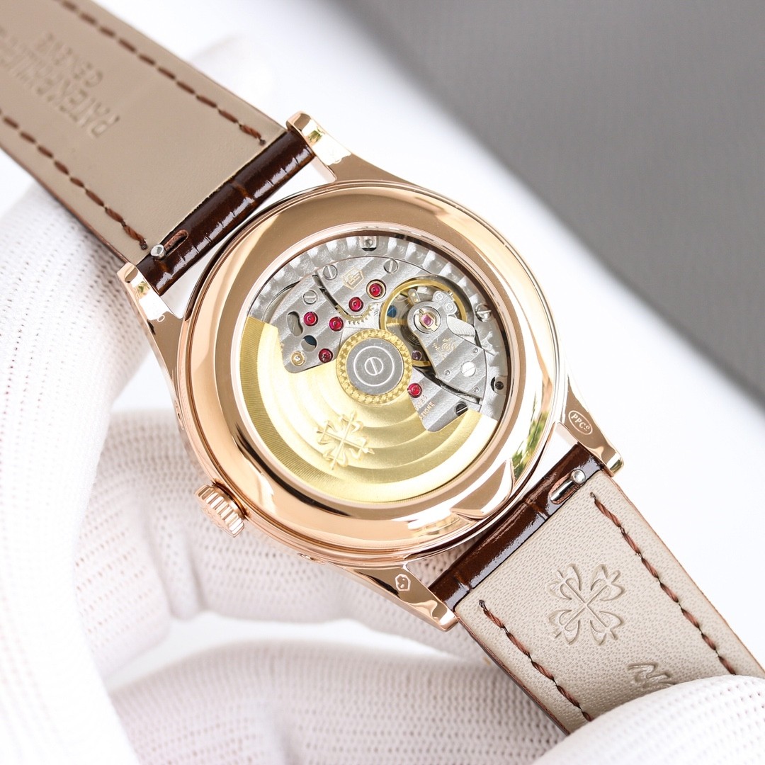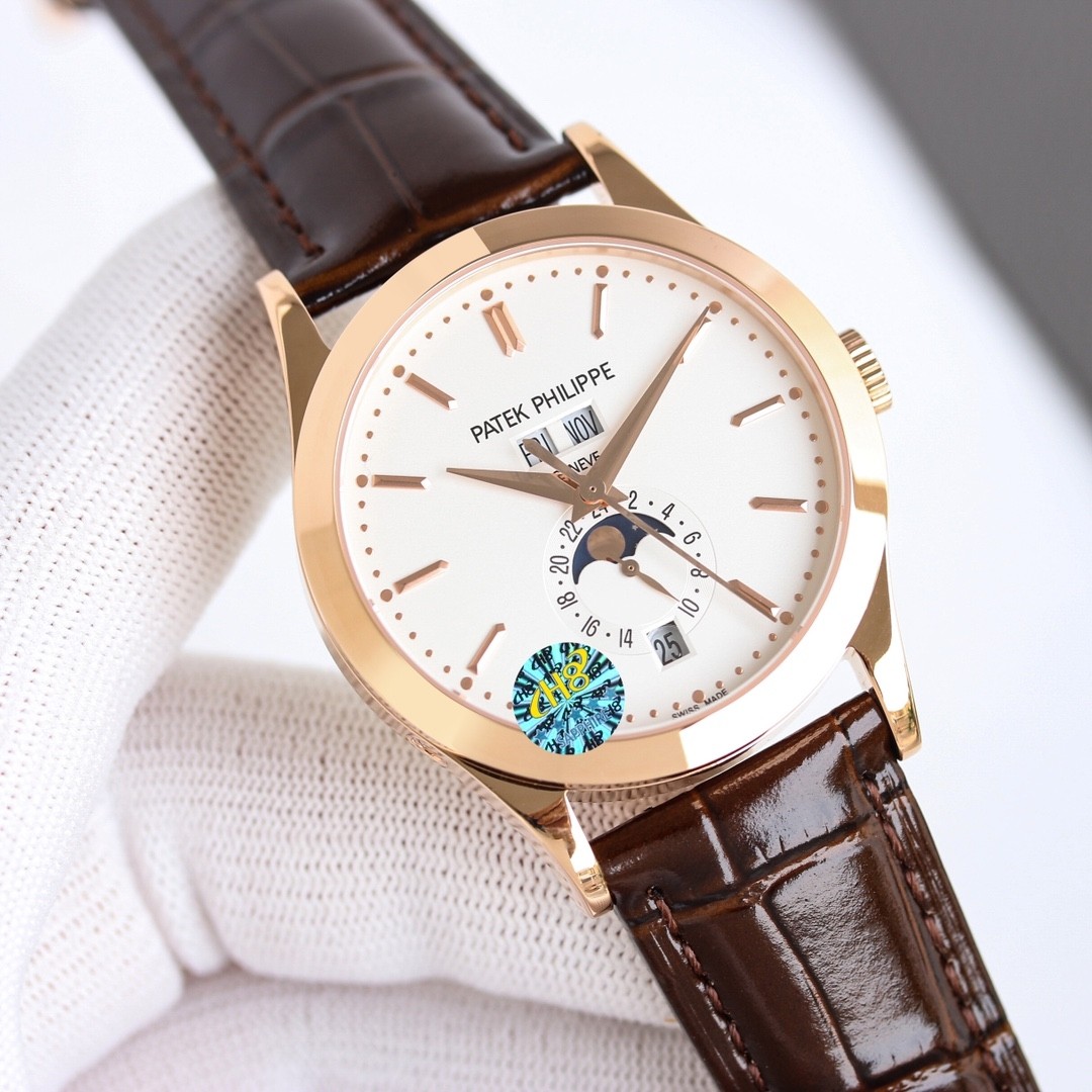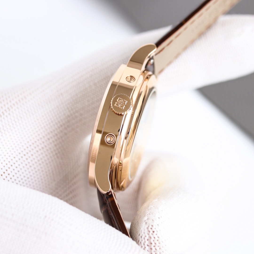 Patek Philippe Complications Annual Calendal 18kt Rose Gold Automatic Mens Watch 5396R-011, 18k rose gold case with a brown alligator leather strap. Fixed bezel. Silvery opaline dial with rose gold-tone hands and index hour markers. Minute markers around the outer rim. Dial Type: Analog. Annual calendar. 24 hour/moonphase sub-dial. Patek Philippe Calibre 324 S QA LU 24H/303 automatic movement with about 35-45 hours of power reserve. Scratch resistant sapphire crystal. Case size: 38 mm. Round case shape. Tang clasp. Water resistant at 30 meters / 100 feet. Functions: annual calendar, moon phase, month, date, day, GMT, second time zone, hour, minute, second.