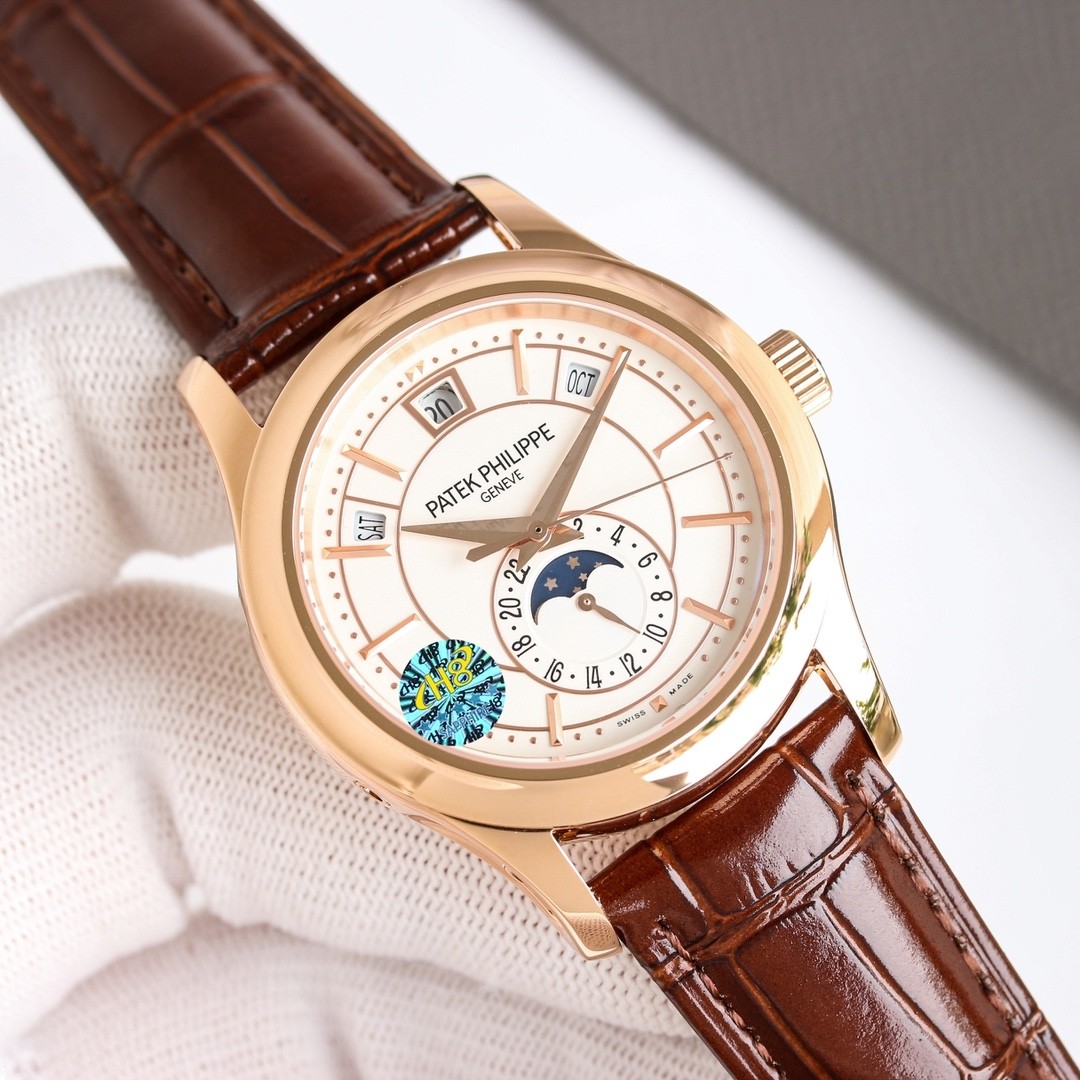 • Patek Philippe Complications Annual Calendar 40mm 5205R-001 White Moon-Phase Dial, 18K Rose Gold Brown Leather Strap