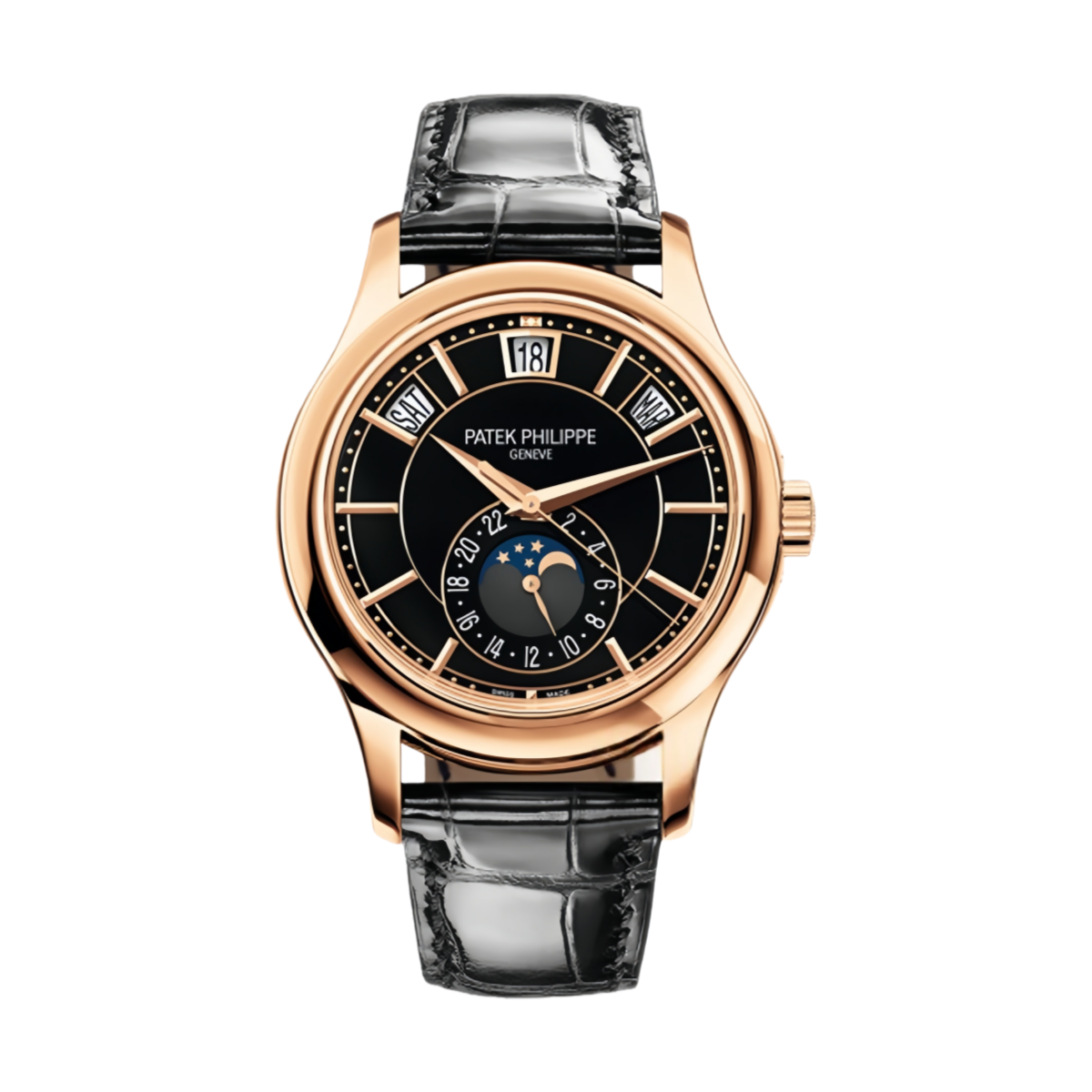 Patek Philippe Complications Silver Moon-Phase 40mm 5205R-010 Black Moon-Phase Dial in 18K Rose Gold Shiny Black Alligator Strap