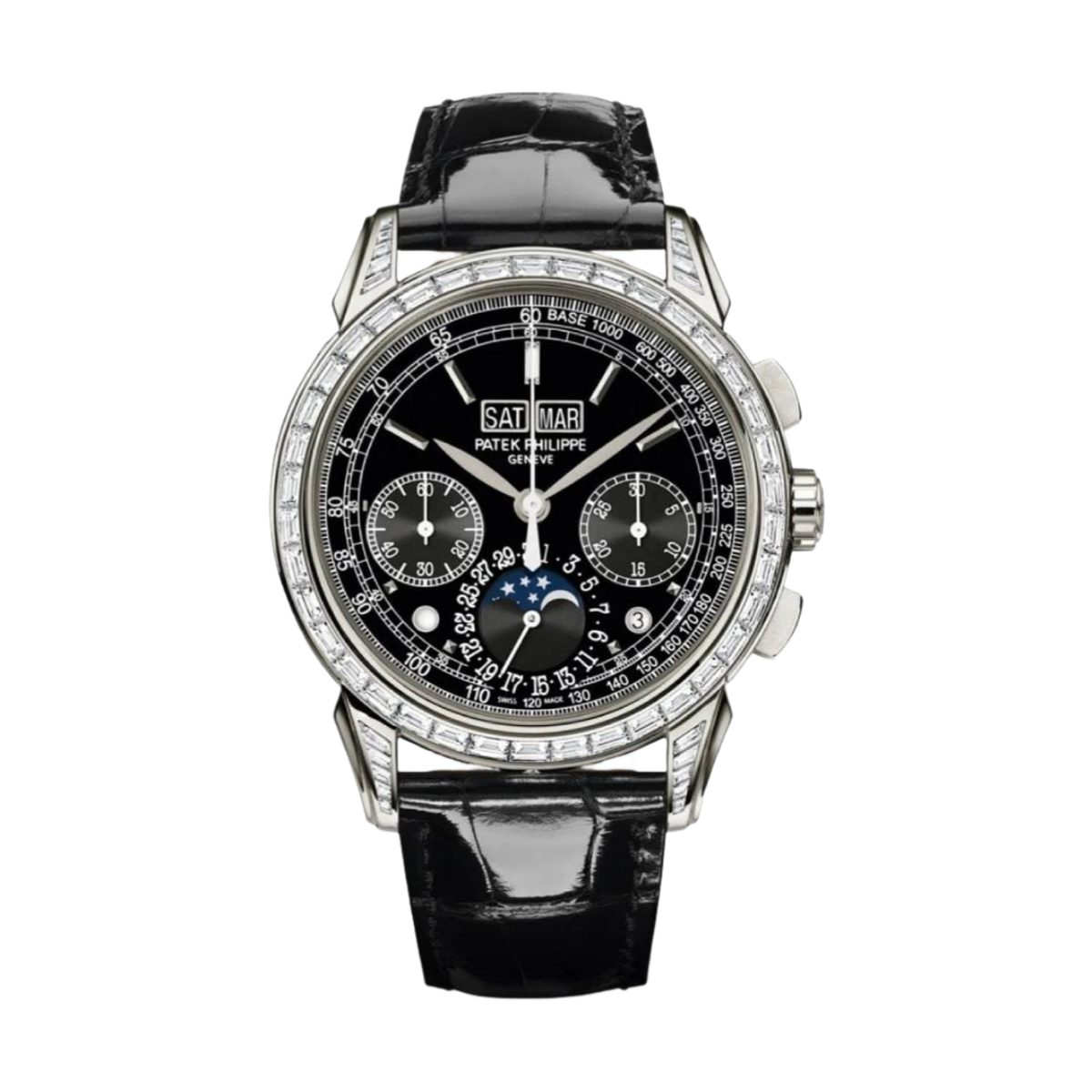 Patek Philippe Grand Complications Chronograph Perpetual Calendar 41mm 5271P-001 Black Moon-Phase Dial & Diamond Bezel in Platinum Case, Shiny Black Alligator Strap