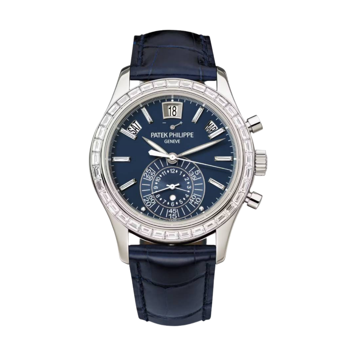 Patek Philippe Complications Annual Calendar Chronograph 40.5mm 5961P-001 Blue Dial & Diamond Bezel in Platinum, Shiny Navy Blue Alligator Strap
